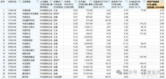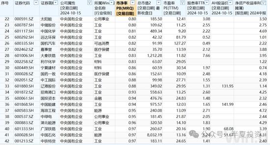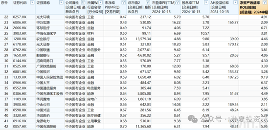 我作念了一个简便的职责,把A股和港股的统统央企,剔恐惧损失的,剔恐惧50亿市值以下太小的,按PB排序(越低的越靠前)。排在前50位的公司别离是底下这些。表格附上了市值,PE,股息率,ROE等要道缱绻。简便的措施,即是股息高的相比好。